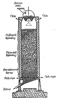 Гарячі гази, що виникають при горінні палива і розкладі вапняку, піднімаючись вгору, поступово охолоджуються, нагріваючи шихту. Палене вапно опускається в нижню частину печі, де охолоджується повітрям, що подається знизу.