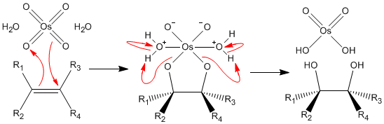 Механізм цієї реакції полягає в тому, що OsVIIIO4 приєднується до алкенів з утворенням R2C=CR2 циклічних «естерів» R4C2O2OsVIO2, що гідролізують з утворенням віцинального діолу та вивільняють тетраоксид осмію (OsVI):