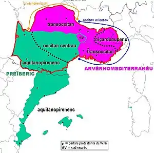 - Центрально-окситанські, тобто лангедокські, за винятком південно-окситанського