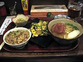Улюблена страва окінавців — чанпуру, що готується з тофу, сезонних овочів та приправ. Іншим її різновидом є суміш гіркого гарбуза (гоя), батату, тофу або яєць, м'яса чи риби або морських водоростей (з бурими водоростями називається мозуку). Все змішується і смажиться на пательні. Найчастіше використовують навіть м'ясні консерви. Особливою популярністю користується американська шинка, яка набула поширення на Окінаві. Впливом американців також характеризується страва тако-рис з м'ясного фаршу, який змішується з рисом і овочами й подається на листі салату разом з гострим соусом сальса.