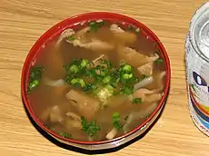 Поширеним є суп зі свинячих ніжок (асі тебіті), в процесі тривалого приготування якого зайвий жир видаляється, а залишаються корисні казеїн і желатин. Популярні також супи тонсоку і суп-місо. З шлунка і нутрощів роблять суп накамі.