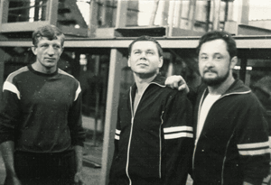 Зварювальник Віктор Утченко (ліворуч), яхтсмени Олексій Грищенко (в центрі) та Євген Платон (праворуч) на будівництві «Фазісі», 1989 рік