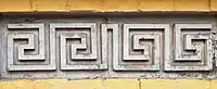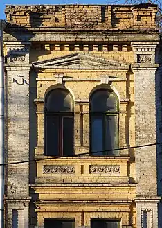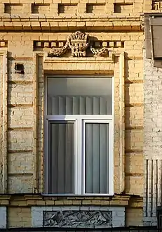 Карнизи будівлі прикрашені дентикулами (декоративними зубчиками). Фасад збагачений цегляним декором.