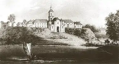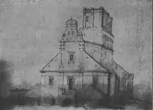 Малюнок 19 століття, невідомий автор. Вигляд Олики. Ратуша, колегіата і стара Троїцька церква, знищена у 1871 році (зліва направо).