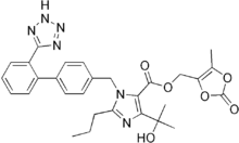 Олмесартан — синтетичний антигіпертензивний препарат, що належить до групи антагоністів рецепторів ангіотензину-ІІ, для перорального застосування. Олмесартан уперше синтезований у лабораторії японської компанії «Sankyo» у 1991 році, яка отримала патент на препарат у 1997 році.[1]