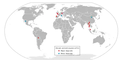 Видобуток і використання олова можна датувати початком бронзової доби близько 3000 до н. е., коли було виявлено, що мідь формується з поліметалічних руд, які через різний вміст металу мають різні фізичні властивості.[2] Оскільки Європа має дуже мало джерел олова, протягом найдавніших часів його імпортували на великі відстані з відомих районів видобутку, а саме Рудних гір (уздовж кордону між Німеччиною і Чехією), Піренейського півострова, Бретані у Франції, Девону і Корнуоллу на південному заході Англії.[3][4]