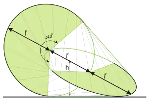де r — радіус дуги олоїда. Оскільки ця різниця досить мала, рух олоїда доволі плавний. У кожній точці під час цього руху кочення олоїд дотикається до площини відрізком прямої. Довжина цього відрізка під час руху залишається незмінною і визначається виразом[1][3]: