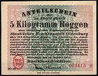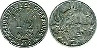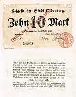 У 1917—1919 роках ув Ольденбурзі виготовлялися нотгельди, які перебували в обігу паралельно з інфляційними монетами та банкнотами Німеччини. У 1917 році торговою палатою (нім. Handelskammer) Ольденбурга виготовили із заліза серію дрібних нотгельдів для розрахунків. Монета номіналом в ½ марку отримала назву серед колекціонерів як «єгерська» марка. На ній було зображено кабана, якого оточили з усіх боків хорти. З 1921 року нотгельди Ольденбурга почали виготовлялися в основному для колекціонерів, або вони виконували роль певних сертифікатів. Відомі цілі серії паперових нотгельдів присвячені, наприклад, собакам на службі Червоного Хреста, які були затверджені сенатом Бремена комісією, яка була сформована з поліції. Також відомі серія нотгельдів на тему літературного гімну Ольденбурга, який написав у 1844 році німецький правозахисник, юрист і письменник Теодор фон Коббе (1798—1845). У 1923 році, під час найважчих гіперінфляційних часів, виготовлялися продовольчі сертифікати.
