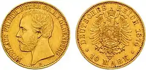 10-марочна монета була викарбувана для Ольденбургу лише один рік у 1874 році. Монета карбувалася зі щирого золота 900 проби, вагою 3,982 грама та діаметром 19,5 міліметрів[9]. 10-марочна золота монета за легендами на аверсі та реверсі була подібною до 2 та 5 марок Пітера II, але голова герцога на монеті була зображена молодою і повернута вліво. Під профілем стояла літера позначення монетного двору «В» — її виготовляли в Ганновері. На реверсі монети карбувався малий імперський орел з великим прусським щитом на грудях, який карбували на усіх монетах Німецької імперії в період 1874—1888 років. Тираж цієї монети був 15.000 екземплярів[10].