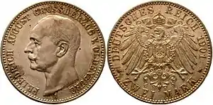 Після смерті Пітера II, 13 червня 1900 року Великим герцогом Ольденбургу став Фредерік Август II. В цьому ж році виготовили монету номіналом в 2 марки. Монета не змінилася в дизайні за попередню. Профіль Пітера II замінився на нового герцога, також змінилася легенда відповідно до нового герцога: FRIEDRICH AUGUST GROSSHERZOG V. OLDENBURG. Ця монета також карбувалася і в 1901 році. Загальний тираж становив 125.000 екземплярів, а також 260 монет були виготовлені як пруф[8].