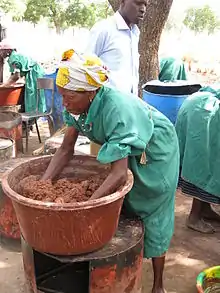 Виробництво олії проходить у декілька етапів. Спочатку збирають дозрілі плоди. Ця робота випадає на сезон дощів, коли збирають врожаї й інших культур. На всіх сільськогосподарських роботах зайняті жінки. Вони збирають падалицю на значній площі в радіусі до 3 км від будинку. Плоди в кошиках несуть на головах додому. Там заривають чани з плодами в землю і тримають щонайменше 12 днів, щоб м'якоть згнила і було легше витягти насіння. Насіння потім варять, щоб воно не проросло. На наступному етапі насіння безперервно смажать протягом чотирьох днів, після чого його можна зберігати дев'ять місяців. Для виготовлення 1 кг олії потрібно 10 кг дров[1].