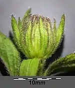 Багаторічна рослина 30–65 см заввишки. Вся рослина вкрита довгими б. м. відстаючими рудуватим жорсткуватими волосками. Кошики порівняно великі (в квітучому стані до 5–5.5 см в діаметрі.), поодинокі або, рідше, ще 2–3 кошики на бічних гілках. Квіти золотистожовті. Крайові язичкові квіти численні, 20–30 мм завдовжки[2].
