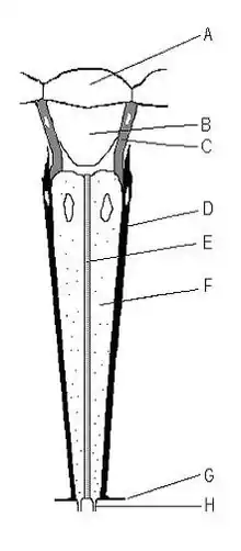 В оматидії можна виділити три основні частини: заломлювальну (діоптричну), сприймальну (рецепторну) та ізоляційну. Заломлювальна частина оматидія складається з двох лінз із незмінною фокусною відстанню. Зовнішня лінза (кришталик) має шість граней і складається з хітину, має двоопуклу форму. Зовні кришталики оматидіїв мають вигляд шестикутних фасеток. У кутах стикання суміжних лінз розташовуються довгі прямі щетинки: вони слугують для захисту ока від пилку і зустрічаються у всіх комах, які відвідують квіти. Під кришталиком розташовані дві корнеагенні клітини, які в процесі розвитку організму виділяють кришталик, а потім перетворюються в пігментні клітини. Друга лінза — кристалічний або кришталевий конус, який розташовується під кришталиком і є прозорим тілом конусоподібної форми з основою, прилеглою до кришталика, і вершиною, зверненою вниз. Рецепторна частина оматидія складається з сильно витягнутих зорових (ретинальних) клітин, з'єднаних радіально у спільний пучок. Найчастіше таких клітин налічується вісім. Вершинні частини, стикаючись між собою, виділяють в процесі розвитку спільну прозору зорову паличку — рабдом. Зовнішній кінець рабдома лежить поблизу вершини кристалічного конуса; протилежний кінець переходить в волокна зорових нервів. Всі ретинальні клітини ока утворюють сітківку складного ока (ретину).