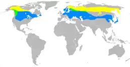 ![]() Мапа поширення омелюха звичайного: жовтий — гніздовий ареал, синій — на зимівлі | ||||||||||||||||