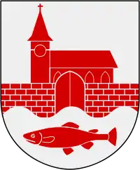Сюжет герба: у срібному полі хвиляста знизу червона мурована стіна з закритими воротами, за якою така ж церква, внизу — червона риба.