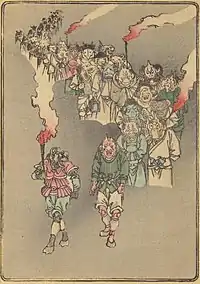 Щорічно на свято Сецубун, 3 лютого, в Японії проводиться церемонія вигнання оні. За звичаєм, хтось із родини проходить у двері, одягнувши маску оні, а інші промовляють «Демони геть! Удача заходь!» (鬼は外! 福は内!)[9]. В Японії існує гра «оніґокко» («гра оні»). Людина, що має наздогнати іншу, в цій грі називається «оні»[10].