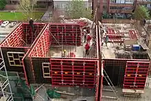 - Об'ємно-переставна — для одночасного бетонування стін та перекриття використовують опалубні секції, які під час встановлення у робоче положення утворюють у поперечному перетині конструкції П-подібної та Г-подібної форми.