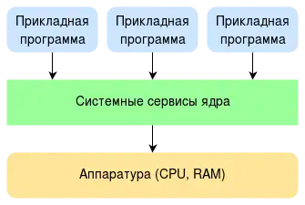 - Монолітна архітектура. ОС визначається як набір модулів, взаємодіючих між собою всередині ядра системи і надають прикладному ПО вхідні інтерфейси для звернень до апаратури. Основний недолік цього принципу побудови ОС полягає в поганій передбаченості її поведінки, викликаної складною взаємодією модулів між собою.