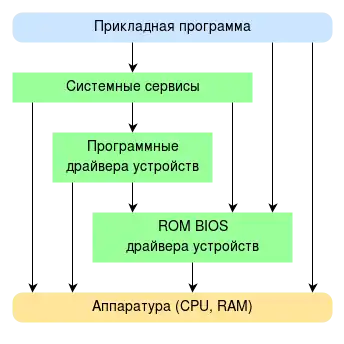 - Рівнева (шарова) архітектура. Прикладне ПО має можливість отримати доступ до апаратури не тільки через ядро системи та її сервіси, а й безпосередньо. У порівнянні з монолітною така архітектура забезпечує значно більший ступінь передбачуваності реакцій системи, а також дозволяє здійснювати швидкий доступ прикладних програм до апаратури. Головним недоліком таких систем є відсутність багатозадачності.