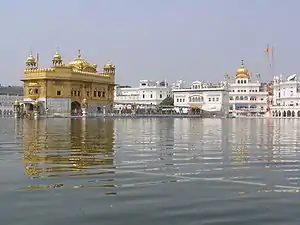 ![]() Вид на частину Золотого храму. Ліворуч знаходиться головна споруда храму Акал Тахт, який значно постраждав від танкового обстрілу в 1984 році Вид на частину Золотого храму. Ліворуч знаходиться головна споруда храму Акал Тахт, який значно постраждав від танкового обстрілу в 1984 році | |||||||