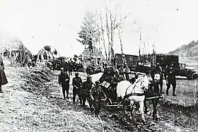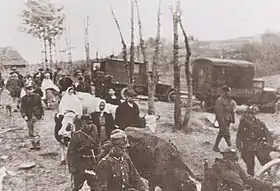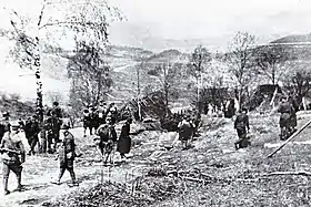 ![]() Примусове виселення українського села у Зах. Бескидах польським батальйоном "Познань", 1947 р. | |