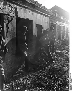 ![]() Німецькі солдати ведуть вуличні бої за опанування радянських позицій у Сталінграді. 1942 Німецькі солдати ведуть вуличні бої за опанування радянських позицій у Сталінграді. 1942 | |||||||