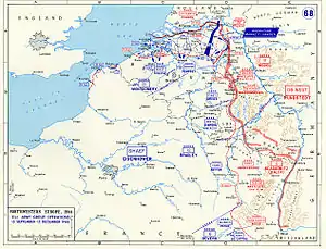 Після висадження союзників у Нормандії, на півдні Франції в червні 1944 року та низки зазнаних поразок, недобитки німецької армії здійснювали поспішний відхід через країни Бенілюкс (Бельгія, Нідерланди, Люксембург) та східну Францію в напрямку німецького кордону. 21-ша група армій Великої Британії (під командуванням фельдмаршала сера Бернарда Монтгомері), 1-ша Канадська Армія, 6-та (генерала Джекоба Л. Деверса) та 12-та група армій США (генерала Омара Бредлі) просувалися вперед, поступово звільняючи окуповану загарбниками французьку територію.