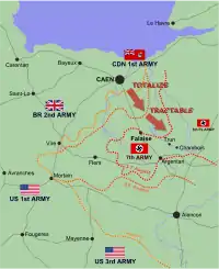 Карта дій канадської 1-ї армії в ході операції «Оверлорд». Перша стадія — операція «Тоталайз», друга — «Трактабл»