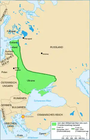 ![]() Карта німецької окупації території колишньої Російської імперії в ході проведення операції «Фаустшлаг» Карта німецької окупації території колишньої Російської імперії в ході проведення операції «Фаустшлаг» | |||||||