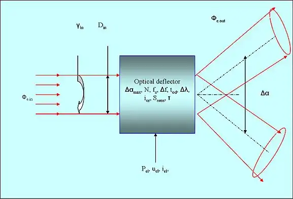 Оптичні втрати визначаються коефіцієнтом пропускання τ потоку оптичного випромінювання: τ = Фe.out/Фe.in= Ie.out/Ie.in, де Фe.in та Фe.out – потоки випромінювання на вході та виході дефлектора, Ie.in та Ie.out – густина потоку випромінювання на вході та виході оптичного дефлектора.