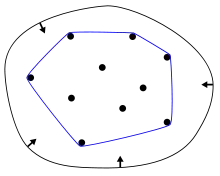 В обчислювальній геометрії, прийнято використовувати термін «опукла оболонка» для межі мінімальної опуклої множини, що містить дану не порожню скінченну множину точок на площині. Для скінченної множини точок, опукла оболонка являє собою ламану лінію.