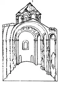 Монастир включає будівлі VIII–IX століть: головний храм — хрестово-купольний будинок з 2 короткими поперечними рукавами, подовженою західною частиною і нартексом (відновлений в X столітті купол на складних пандатах завершено зонтичним покриттям), трапезну з 3-нефним залом та інші будівлі.
