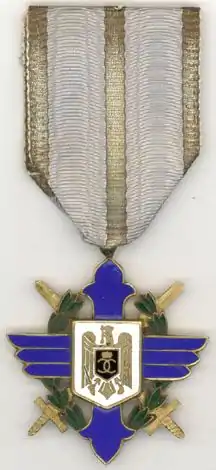 Срібний позолочений хрест, покритий синьою емаллю, оточений вінком з лаврового листя, покритого зеленою емаллю. Хрест аналогічний ордену Михая Хороброго, але бокові промені хреста мають форму крил. На аверсі в центрі хреста зображений білий щит з позолоченим орлом, на реверсі — рік заснування ордену. Груди орла закриває чорний щит з літерою С (Кароль II), з 1940 року — синій щит з літерою М (Міхай I). Ордени, вручені за бойові заслуги, також мали схрещені мечі. Золотий хрест відрізнявся від вищих ступенів ордена відсутністю емалі.