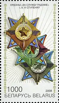 28 серпня 2008 року Белпошта випустила серію поштових марок під назвою «Державні нагороди Республіки Білорусь» номіналом 1000 рублів. На марці № 743 на білому фоні зображено ордени «За службу Батьківщині» І, ІІ, ІІІ ступенів. Дизайнери Іван Лукін та Олег Гайко. Розмір 29,6×52 мм. Тираж 35 тисяч марок.[3]