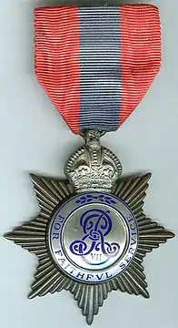 Знаком ордену була восьмикінцева срібна зірка, верхній промінь якої прикриває корона; золотий центральний медальйон містив вензель чинного монарха, оточений легендою «За вірну службу» ('For Faithful Service'). Це було замінено червоною стрічкою із синьою центральною смугою.