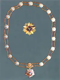 Зірка ордена дещо більшого розміру й візуально повторює знак, за винятком емалі, що покриває промені зірки і діамантів на штралах. Промені зірки гранчасті.