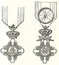 Під час нагородження військовослужбовця за бойові заслуги вручався знак з мечами (перехрещені мечі між променями хреста чи між короною та верхнім променем хреста).