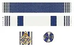 Орденська стрічка — темно-синя з білими полями по краях.