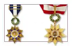 - Командор — знак ордена на шийній стрічці і срібна зірка на лівій стороні грудей.