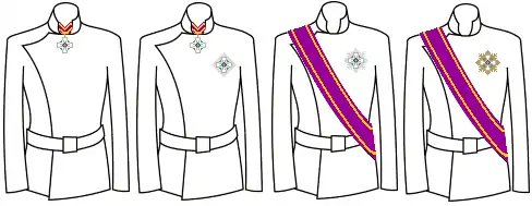 Кавалерський хрест мав діаметр 35 мм і носився на лівому боці грудей на стрічці. Офіцерський хрест аналогічний кавалерському, проте на стрічці мав розетку. Командорський і великий офіцерський хрести мали діаметр 50 мм і носились на шийній стрічці, до великого офіцерського хреста додавалась чотирикутна нагрудна зірка діаметром 60 мм. Великий хрест також мав діаметр 50 мм, але носився на плечовій стрічці, з восьмикутною нагрудною зіркою діаметром 80 мм.