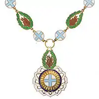 Ланцюг ордена складається з ланок у вигляді хреста блакитної емалі в білому колі, та полум'я червоної емалі в лавровому вінці зеленої емалі.