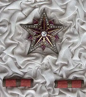 Матеріал: золото, 45 рубінів, емаль, 61 діамант - найбільший розміром 6 мм, решта - 3 мм. Стрічка: червона з 2 мм золотими смужками по краях з мініатюрним знаком ордена (10 мм діаметром) в центрі.