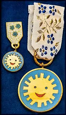Орден виглядає як медаль, покрита блакитною емаллю із зображенням сонця, що посміхається. Орденська стрічка із білого муару із зображенням квітів.