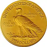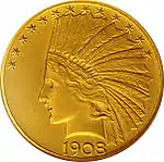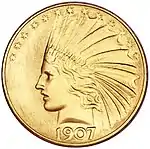 З 1907 року починають випускатися 10 доларів із зображенням індіанця. Новий дизайн монети був розроблений за особистим дорученням 26-го президента США Теодора Рузвельта скульптором Августом Сент-Годенсом. Перші карбовані монети відрізнялися високим рельєфом зображення і відсутністю девізу «IN GOD WE TRUST». Випуск «безбожних» монет був навмисним, так як Рузвельт вважав згадку слова «Бог» (англ. God) на монетах святотатством. Але приміщення девізу «IN GOD WE TRUST» на золотих монетах номіналом більше 3 доларів було визначено ще монетним актом 1864 року. Кілька членів конгресу наполягли на припиненні випуску «безбожних» монет[3][4].