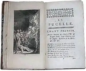 - Французское pucelle («девственница») в классическом языке — сниженное слово по сравнению с vierge («дева»); тем не менее, в средневековую эпоху обычным эпитетом Жанны было именно La Pucelle, и так она называется в апологетических сочинениях, в том числе в пародируемой Вольтером поэме Шаплена.