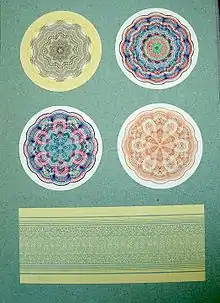 Друкарська фарба окремими фарбовими системами за допомогою шаблонів закочується чотирма різними фарбами (не враховуючи «ірисів»), причому типографія фарбових меж задається малюнками шаблонів.