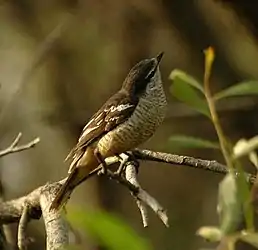 Довжина птаха становить 19 см. Виду притаманний статевий диморфізм. У самців верхня частина тіла переважно чорна, надхвістя сіре, нижня частина тіла біла, поцяткована тонкими темними смужками, нижня частина живота і гузка світло-коричневі. Над очима білі "брови", на крилах білі смуги. Забарвлення самичок переважно сірувато-коричневе, нижня частина тіла у них сірувато-кремова, поцяткована темними смужками.