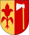 Сюжет герба: щит розтяий, у правому золотому полі червона квітка з двома листками і корінням, у лівому червоному — срібна сокира зі золотим руків'ям.