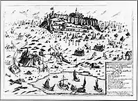 - Перша Австро-турецька війна 1526–1555 Після розгрому угорського війська під Могачем 1526 османи вийшли безпосередньо до володінь Габсбурзької монархії. Через претензії Фердинанда I Габсбурга на угорську корону і успішну боротьбу з Яношем І Заполья султан Сулейман І розпочав війну і османсько-сербсько-молдавське військо 8 вересня захопило Буду, тримало в облозі Відень 27 вересня — 14 жовтня 1529[34]. Завдяки участі османів у інших конфліктах австрійцям вдалось відбити декілька фортець на Дунаї і Сулейман І 1532 знову вирушив на Відень, але при облозі Гюнса[35] 700 оборонців стримували 120.000 османське військо 5-30 серпня і через близьку зиму османи відступили. Було укладено 1533 перемир'я, яке визнавало володіння Яноша І і Фердинанда І в Угорщині. Після смерті Яноша І в порушення договору його сина Яноша ІІ обрали королем, а мир з Венецією звільним сили осман, які захопили на Дунаї декілька замків, після чого уклали перемир'я. 1552 османи невдало облягали Еґер, після чого 1555 за мирною угодою Угорщина була поділена на три частни.