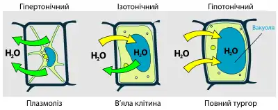 У природних умовах клітини переважно стикаються із проблемою перебування в гіпотонічних розчинах. Щоб запобігти осмотичному лізису вони виробили ряд пристосувань. Наприклад бактерійні, грибні і рослинні клітини мають жорстку клітинну стінку, яка може перешкоджати надмірному надходженню води. Рослини використовують осмос для досягнення механічної стійкості і пружності: висока концентрація розчинених речовин у центральних вакуолях призводить до затягування води в клітини, але це має наслідком не набухання, а збільшення тиску мембран на клітинні стінки, тобто виникнення тургору. Внаслідок цього клітини, і ціле тіло рослини, стають твердими і пружними. Зневоднення призводить до в'янення рослин[1]. Рослинні клітини можуть регулювати тургорний тиск шляхом зміни концентрації осмотично активних речовин, таких як сахароза і неорганічні іони, у центральній вакуолі та цитоплазмі. З цим пов'язано багато аспектів життя рослини: закривання-відкривання продихів, створення тиску у ситоподібних трубках флоеми, що необхідний для транспортування продуктів фотосинтезу, фітогормонів та інших речовин, створення кореневого тиску, потрібного для перенесення води та мінеральних речовин, здійснення рухів, таких як відкривання-закривання пелюсток, піднімання-опускання листків тощо[4].